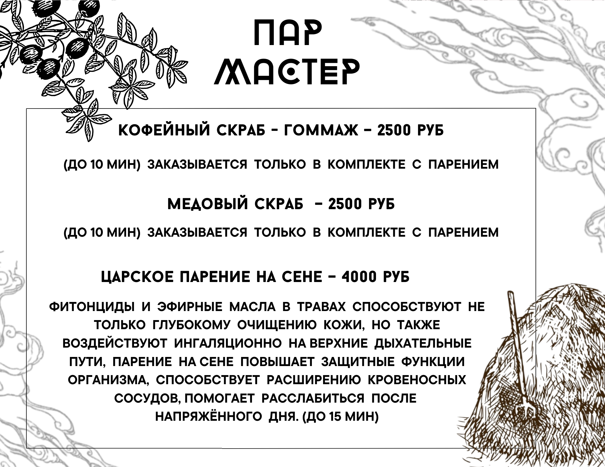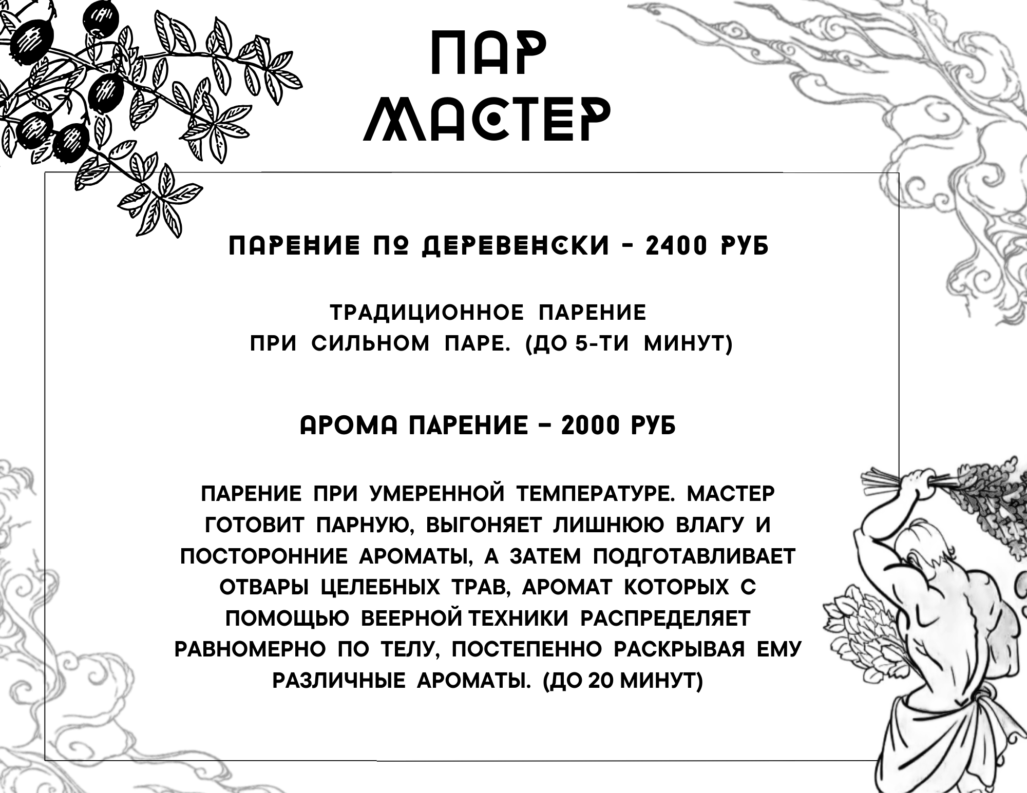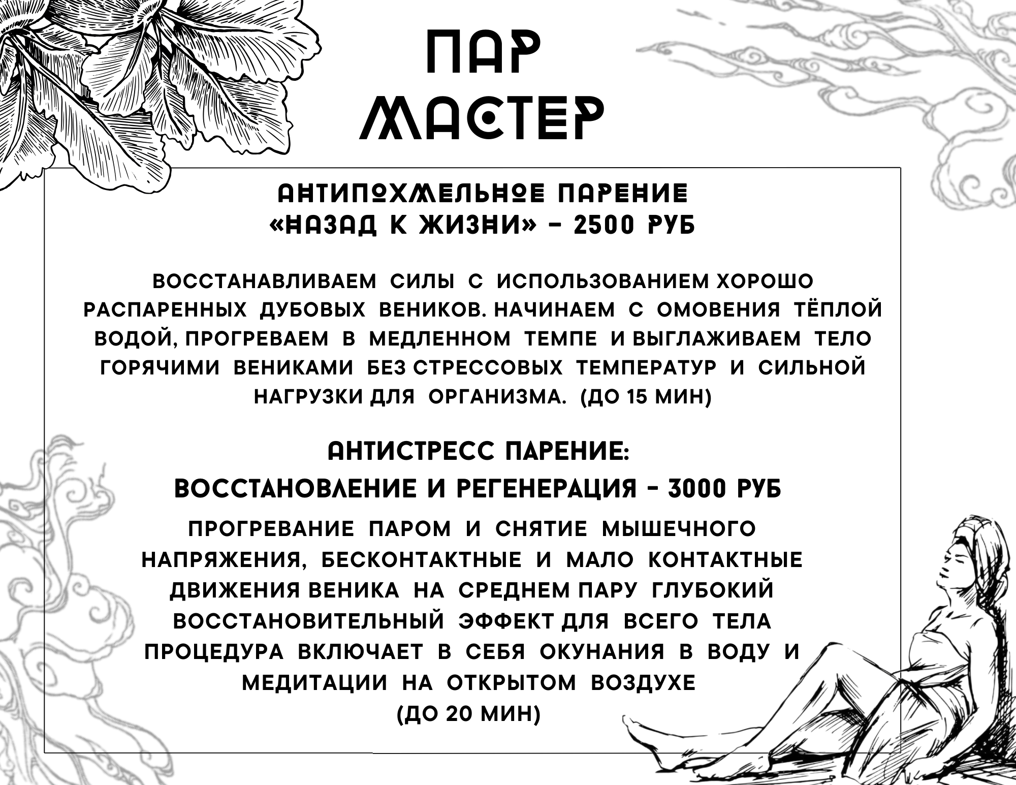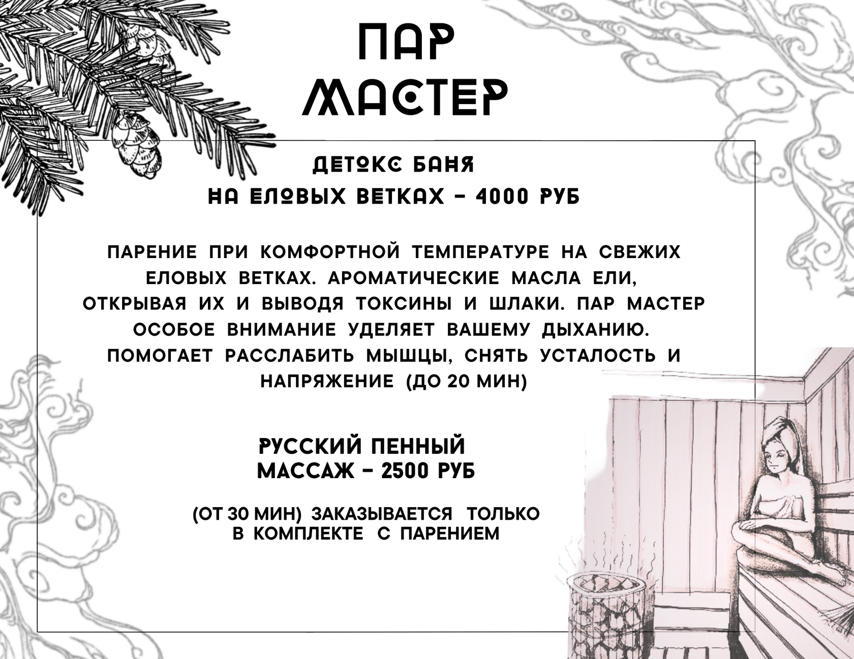 Эксклюзивные программы парения нашего Пар Мастера — это неповторимые концепции банного ухода. В них гармонично сочетаются веничный массаж, оригинальные спа-техники, контрастные процедуры, обливания, аромалогия и другие секреты традиций.